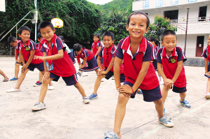 小學(xué)生們?cè)趯W(xué)校操場(chǎng)上體育課。