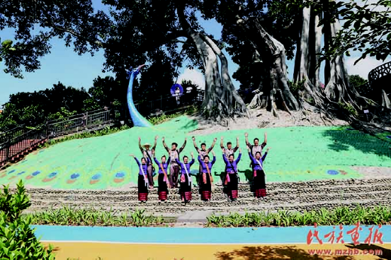 村民在孔雀雕塑下歡迎來到芒里村的游客。
