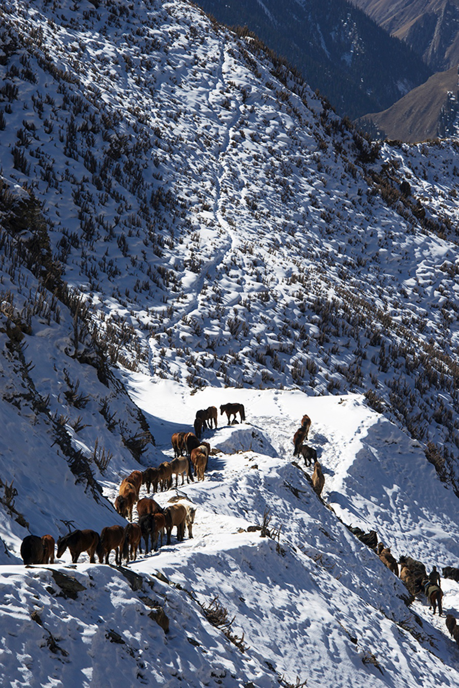 喬隆格爾冬牧場(chǎng)與山外的氣候差異大,暖陽(yáng)如春。另一個(gè)突出特點(diǎn)是草好,草密的地方?jīng)]膝,縱橫倒伏一片,比南方秋田摞在一起的蒲草都密實(shí)??諝馇邃?,腐草味兒、上一年遺留的畜糞味兒和著遠(yuǎn)處高大冰崖透散過來的寒氣撲面而來,最突出的還有野生動(dòng)物的腥氣,牧羊犬夜夜不停地叫聲在告訴你它們往復(fù)經(jīng)過的頻率。山上能看到大角的北山羊,野鵪鶉被驚到嘩啦啦地飛起一片。若是誰家的羊死了扔在野外,幾天都能看到禿鷲在天空盤旋。最不可思議的是雪豹,光顧一次造成的損失遠(yuǎn)比一群狼大。