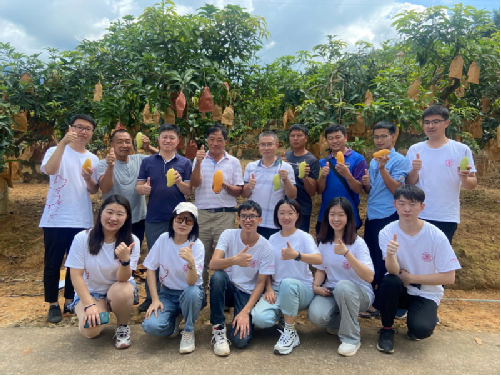 三是恩樂(lè)鎮(zhèn)玻烈村芒果種植地調(diào)研。9月4日上午,實(shí)踐團(tuán)成員前往恩樂(lè)鎮(zhèn)玻烈村芒果種植地,對(duì)基地的病蟲(chóng)害情況進(jìn)行調(diào)研。調(diào)研中,種植戶向?qū)嵺`團(tuán)成員詳細(xì)介紹了基地的氣候條件、技術(shù)管控以及所使用的肥料和農(nóng)藥。通過(guò)種植戶的介紹以及實(shí)地觀察,實(shí)踐團(tuán)成員結(jié)合所學(xué)知識(shí),指出了種植基地存在的病害和發(fā)生規(guī)律,并給出了具體防治意見(jiàn)。
