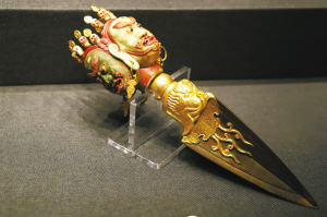 持驗法器單元主要展示修持佛法、舉行佛事活動和佛教儀式時所用的法器,包括金剛鈴、金剛杵、嘎巴拉碗、嘎巴拉鼓、嘎巴拉念珠、喀章嘎、金剛橛、鉞刀等。本部分所選法器多為藏傳佛教密宗修行所用,因多存于庫房,已不在原佛堂陳設(shè),其用途和使用場所便難以知悉。故宮中有許多佛堂,大多是乾隆時期建造,其中很多是密宗佛堂,如雨花閣、梵華樓、梵宗樓、養(yǎng)心殿西暖閣佛堂等。