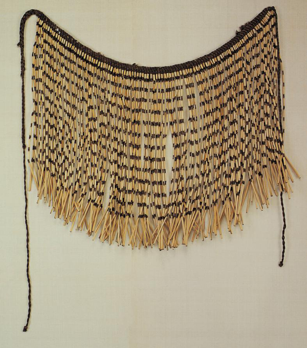 博嘎?tīng)枊D女穿一種叫“基都”的短上衣。用野麻織成的土布縫制,其樣式為無(wú)領(lǐng)、短袖、對(duì)襟。下部穿用羊毛織成的粗呢緊身筒裙,稱作“結(jié)邦”。小腿部扎裹腿,叫“涅蘇木”。條件好的人家外面還會(huì)罩一件稱為“階納布”的披肩。希蒙部落的婦女穿當(dāng)?shù)孛藁棾傻陌咨蛩{(lán)色的寬大對(duì)襟短上衣。下身穿筒裙,裙子下擺較寬,上面織有黃紅色或黃黑色的簡(jiǎn)單圖案(圖為民國(guó)時(shí)期的珞巴族草裙,中央民族大學(xué)民族博物館館藏)。