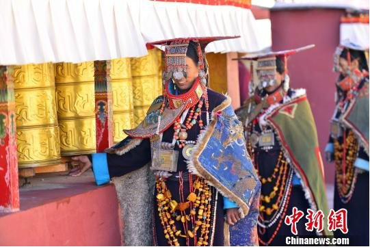 盡管歷史悠久,但它并沒有隨著時光的流逝和時代的變遷而被束之高閣,實(shí)際上,即便是今天,這些服飾仍然是當(dāng)?shù)刂匾淖诮袒顒又斜夭豢缮俚膬?nèi)容,在科迦寺每年藏歷1月12日大譯師仁青桑布建成108座殿堂和寺廟的慶功紀(jì)念日上,科迦村有這套服飾的7戶家庭的婦女都要穿上這套服飾在科迦寺僧人跳神舞的間隙表演宣舞。