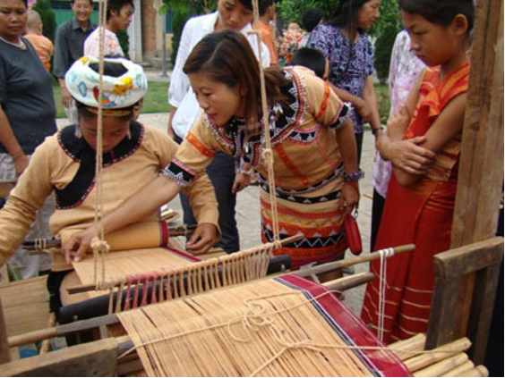 2010年上海世博會(huì)活動(dòng)周期間,一臺(tái)名為《記憶云南》的18項(xiàng)非物質(zhì)文化遺產(chǎn)展示成為最吸引眼球的亮點(diǎn)之一?;顒?dòng)現(xiàn)場(chǎng),18名云南非物質(zhì)文化遺產(chǎn)傳承人和民間藝人展示白族布扎、納西族東巴畫(huà)、傣族剪紙、傣族竹編、佤族織錦技藝等制作技藝。其間展示的佤族織錦技藝在民族文化風(fēng)情濃郁,文化底蘊(yùn)深厚的耿馬縣佤族村寨里流傳甚廣。在耿馬的佤族村寨里,婦女們一般都會(huì)紡線(xiàn)織布,佤族傳統(tǒng)服飾也多用自染自織的土布縫制。此地佤族傳統(tǒng)服飾按地域分為兩大類(lèi)。一類(lèi)是分布在耿馬鎮(zhèn)、四排山鄉(xiāng)的傳統(tǒng)服飾,以女性身著佤族紅色短衣筒裙、男子身著佤族黑衣寬褲為標(biāo)志;一類(lèi)是分布在勐簡(jiǎn)鄉(xiāng)大寨村的“黃衣阿佤”服飾,以女性身著佤族黃衣筒裙、男子身著黃衣寬褲為標(biāo)志。佤族婦女所用的紡線(xiàn)有棉線(xiàn)、麻線(xiàn)兩種。棉主要是草棉,麻主要為苧麻和野生火麻,紡線(xiàn)采用內(nèi)地傳入的有紡錘的紡車(chē)。在耿馬鎮(zhèn)芒國(guó)村芒俄村民小組等佤族聚居村寨,筆者先后目睹了佤族織錦的全過(guò)程。只見(jiàn)紡織 中的佤族婦女一個(gè)個(gè)端坐在紡車(chē)前,凝神專(zhuān)注地操持著手中的活計(jì)。她們左手持麻,右手持紡錘,將紡錘放在大腿上一搓,紡錘轉(zhuǎn)動(dòng)起來(lái)后,把麻纖維慢慢從左手拉出并捻成線(xiàn),紡好一截線(xiàn)便將它繞到小竹棍上。如此這般不停地左右穿梭,又不斷地再搓、再捻,紡出的布匹紋理細(xì)密、結(jié)實(shí)挺拔。耿馬四排山鄉(xiāng)織錦的佤族婦女,大多采用一套竹木制的很原始的腰機(jī),前后上下共有十七個(gè)零件。紡線(xiàn)時(shí),她們將線(xiàn)的一頭栓在婦女腰上,另一頭用木棍穿好,擱在織布處釘在地上的兩根木樁上。織時(shí)兩頭繃緊,將繞在木棍上的緯線(xiàn)穿到經(jīng)線(xiàn)的中間,然后用抒刀把線(xiàn)打緊。這種織法節(jié)奏雖然慢一些,但織出的布更加厚實(shí)緊繃,適用于紡織粗布和麻袋。在勐簡(jiǎn)鄉(xiāng)大寨村的穿“黃衣”的佤族婦女,用黃土、玉米粉、茶葉、小飯豆、欖樹(shù)皮等7種植物做原料浸染的黃色棉線(xiàn)織錦,使用的有竹木制腰機(jī)和紡錘紡車(chē)兩種??楀\時(shí),只見(jiàn)她們一邊捻線(xiàn),一邊傳遞紡錘。不織時(shí),又把紡錘和抒刀拆下,依然卷起放好。來(lái)自耿馬鎮(zhèn)、四排山鄉(xiāng)、勐簡(jiǎn)鄉(xiāng)的佤族群眾介紹,中華人民共和國(guó)成立后,由于商店里賣(mài)的布料比佤族自織的布料更價(jià)廉物美,佤族人家自己紡織制作服飾的已經(jīng)不多,但是縫制麻布被和麻袋用的麻布,還是多數(shù)來(lái)源于自家紡織,尤其是佤族村寨婦女穿的裙子,也必須是自己織,不然會(huì)被人同族人恥笑為愚笨和懶惰。2009年以來(lái),每年5月中旬,耿馬都要舉辦佤族“青苗節(jié)”慶典活動(dòng)?;顒?dòng)期間,該縣不僅上演豐富多彩的文藝節(jié)目和民間體育比賽項(xiàng)目,還現(xiàn)場(chǎng)展示該縣獨(dú)具特色的佤族織錦技術(shù)??楀\展示中,來(lái)賓增長(zhǎng)了對(duì)佤族傳統(tǒng)手工技藝方面的知識(shí),不少?lài)^群眾還饒有興趣地一邊詢(xún)問(wèn)織錦者,一邊親自動(dòng)手體驗(yàn)這項(xiàng)古老而傳統(tǒng)的紡織技藝。