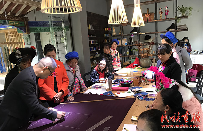 在古色古香的云南省楚雄市彝人古鎮(zhèn),排排具有民族風(fēng)情的街鋪門面中,有家令人耳目一新的店面,僅是它素雅的名字和文藝的裝修,就不斷吸引著路過的游客前去一探究竟,這就是楚雄索玉文化美學(xué)創(chuàng)意有限公司工作室的所在地?!昂芏辔乃囆∏嗄赀M(jìn)店后,被我們家精致的創(chuàng)意彝繡飾品和服飾所吸引,拿起來愛不釋手?!彼饔竦脑O(shè)計(jì)師盧潔瑩說道。盧潔瑩的氣質(zhì)就如工作室的布置風(fēng)格一樣,溫文儒雅又落落大方,她身穿一身自己設(shè)計(jì)的彝繡服飾,正俯身指導(dǎo)著員工。