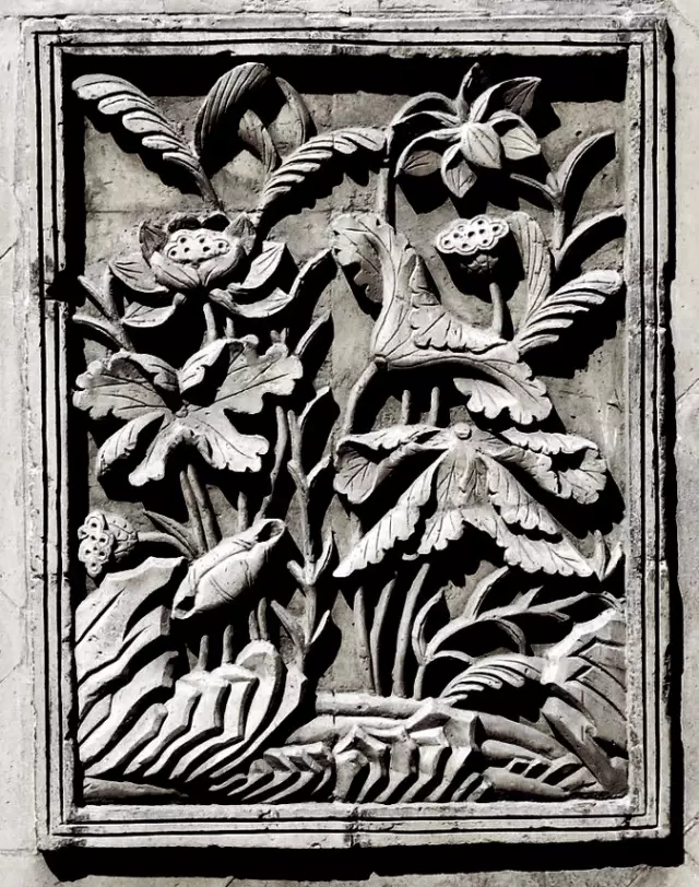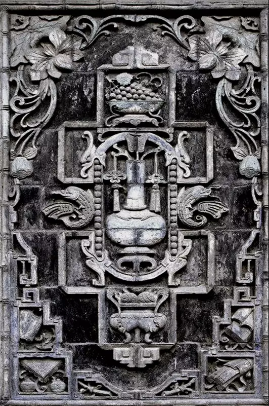清代,北京紫禁城宮廷內(nèi)墻面夾柱的通氣孔也都使用磚雕,鏤雕花鳥(niǎo)圖案,牢固磚雕 而美觀,且利于空氣流通。