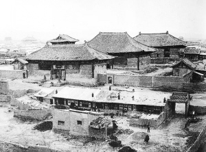 在梁思成拍攝的圖片中可以看到:古老的寺院被參差的民居包圍,4座嵯峨的殿宇高高矗立在城市的天際線上,建筑魁偉,景色壯觀。山門前有一處大院,院內(nèi)有人還養(yǎng)著牛。遠(yuǎn)處西北方向可見華嚴(yán)寺薄伽教藏殿和清遠(yuǎn)門城樓,北面可見城墻上的箭樓和鐘樓。