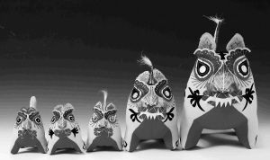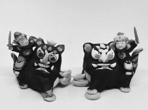 泥叫虎是山東高密的一種民間泥塑,起源于明代萬歷初年,是形、色、聲、動俱佳的民間工藝品,與撲灰年畫、剪紙并稱為“高密三絕”。泥叫虎腰部由牛皮連接,擠壓其頭部和尾部后,會發(fā)出響聲,叫虎一名由此而來。河南也有叫虎,又稱皮老虎。相較之下,山東的泥叫虎更具特色,而且在藝術風格上更大氣,樣式憨態(tài)可掬,哨子發(fā)出的聲音也十分有趣。