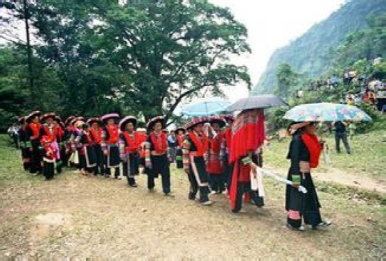 這里的"女婚男嫁"特點,大體上有這么幾個階段。當(dāng)男女青年都長到18歲后,就開始講究修飾,喬裝打扮一新,女青年似花蕊朵朵,男青年個個英俊瀟灑。通過趕街、走親訪友、耍老表、節(jié)假日唱山歌,打陀螺,拋毽子等方式,進(jìn)行談情說愛,互相了解,這是認(rèn)識階段。在認(rèn)識基礎(chǔ)上,雙方互請到家做客,彼此進(jìn)一步掌握對方為人、性格,家庭成員,家庭經(jīng)濟(jì)等情況。這是加深認(rèn)識、了解、建立愛慕之情階段。每逢農(nóng)忙季節(jié)和節(jié)假日,女方總要請男方來幫助犁地、耙田,耕種,收割,蓋房子等,這是考察對方勤勞能干還是好逸惡勞階段,是最關(guān)鍵的階段經(jīng)過一兩年的交往接觸,雙方產(chǎn)生了深厚感情,女方就偷偷買布,精心地打好精致的布鞋送給男方,男方收到信物后,就選擇買手鐲、頭簪、戒指,耳環(huán)或手表等其中的一兩件送給女方,彼此作為定情物,確定自己的心上人。但是,這些交往仍然是在秘密的條件下進(jìn)行,屬保密階段。經(jīng)過以上四個階段以后,女方便請男方派老人帶上幾斤酒,糖,一些煙餅等禮品來訂親,要求上門,將婚事公布于眾,從這以后,女方就負(fù)責(zé)籌備一切嫁妝、床上用品、家具等。待東西備齊,女方就擇日接男方過門。