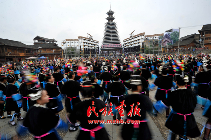 此外,侗族還有些極具民族特色的民族節(jié)日或活動。例如斗牛節(jié),一般在每年農(nóng)歷二月與八月的亥日舉行。侗族每個村寨幾乎都有為比賽而飼養(yǎng)的“水牛王”,“牛王”的圈稱為“生宮”?!芭M酢币话阌袑H孙曫B(yǎng),其吃的食物除了飼料,還有蜂蜜、豬油等,可見侗族人民對此的重視程度。還有“為也”,這是個音譯的名稱,是做客的意思,它特指村寨之間互相訪問的集體客人,這是侗鄉(xiāng)規(guī)模最大的社交和娛樂性活動,一般在春季或秋后舉行。貴州黎平、榕江、從江一帶的“為也”隊伍多以歌隊或戲班為主?;顒訁⑴c人數(shù)從10人到100人不等,男女老少皆可參加,場面十分熱鬧。與之類似的還有南侗地區(qū)的“為嘿”“為頂”“行歌坐月”等活動。“為頂”“行歌坐月”是村寨男女青年之間互訪、社交的活動。還有每年農(nóng)歷六月的第一個辰日“林王節(jié)”,是紀(jì)念侗族農(nóng)民起義軍領(lǐng)袖林寬的節(jié)日(圖為薩瑪節(jié)上盛裝的侗族姑娘。寧堅攝,引自民族畫報)。