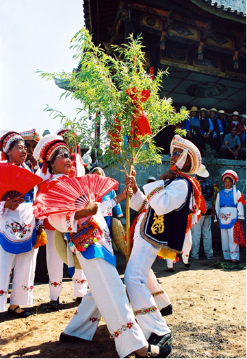 “繞三靈”活動的特點,除了向本主神靈祈求風(fēng)調(diào)雨順的內(nèi)容之外,主要在于其歌舞活動所表現(xiàn)的男女情愛無所顧忌,放達不拘。每個歌舞隊列領(lǐng)頭者均為男女巫二人,他們以一手共執(zhí)一株齊人高的樹枝,另一手分別揮舞牦牛尾和花手巾,邊舞邊唱,引領(lǐng)著隊伍緩緩前行。樹枝上掛著紅綢系著的葫蘆,據(jù)說葫蘆象征母腹,紅綢象征陰血。他們口唱的調(diào)子稱“活恩枯”直譯為“花柳曲”,一唱一和,幽默風(fēng)趣。其后的歌舞隊列,唱的也都是充滿艷情的調(diào)子,跳的是霸王鞭和八角鼓舞,舞姿多有男女背靠背、心合心、腳勾腳等形式,無拘無束地表達著熾熱的情感。