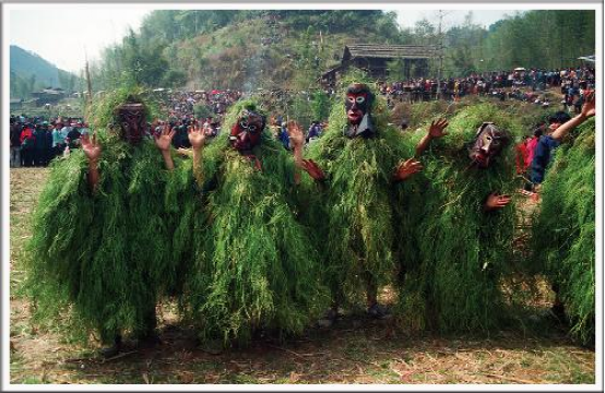苗族芒篙的固定形象,是面帶古怪的木儺面具,身披齊膝的虎臥藤,手持過(guò)頭的竹棍,小腹前掛著長(zhǎng)長(zhǎng)的象征男性生殖器之物,它們單數(shù)組合,多為11——15個(gè)。