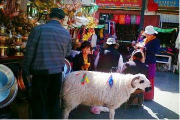 在西藏的許多寺廟及附近,常常會(huì)有單獨(dú)的、或三三兩兩的脖頸上系著紅布條沒有主人的羊只。主人把它們放生,使它們重歸自然,成為自由的羊,免去了挨宰遭殺之罪。習(xí)慣上,這些羊就叫做放生羊。轉(zhuǎn)經(jīng)人會(huì)自覺自愿給它們吃的東西,它們不會(huì)為肚子饑餓而亂躥。也許正因?yàn)槿绱?,這些放生羊才會(huì)顯得非常乖巧溫順。
