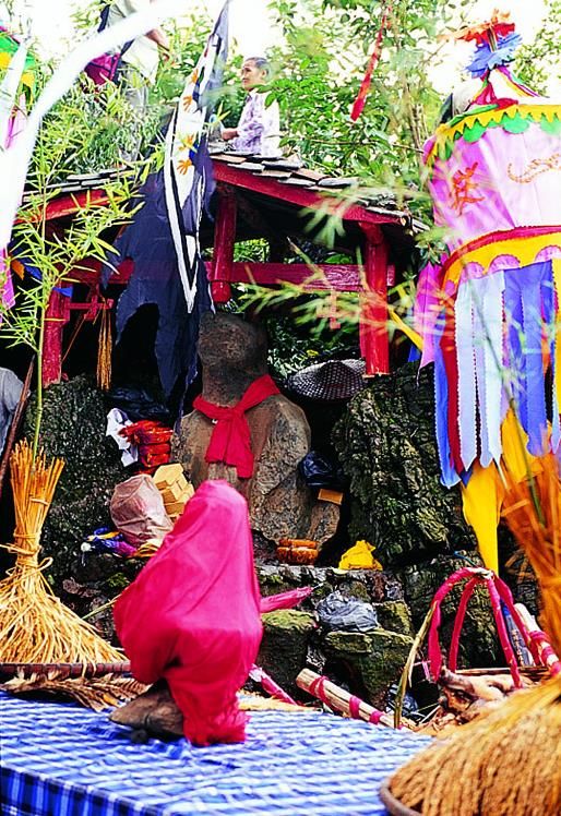 敬霞儀式在霞堂舉行。霞堂設(shè)有祭壇。壇前立著一根竹竿,竿頂上站立一只公雞。祭壇中是主祭席,其友有用松針?shù)伋墒€(gè)祭祀點(diǎn),由宗族各支系擺設(shè)祭品。敬霞這天,各支系由德高望眾者領(lǐng)隊(duì)。抬著豬肉、糯米飯、米酒等食品列隊(duì)進(jìn)入霞堂。一路上銅鼓、銅鑼、欽、革鼓被敲得冬嚏冬嚓地響,人們跟在后面吆喝著前進(jìn)。祭典開(kāi)始,鑼鼓暄天。接著由執(zhí)壇的水書(shū)先生念讀敬霞的祝詞,內(nèi)容多為祈福禳災(zāi),期冀風(fēng)調(diào)雨順,人壽年豐之類(lèi)。祝詞之后便酪酒祭之:此后,由兩個(gè)身穿白衣的小伙子抬一母豬到田壩中繞行,后面那位不時(shí)用松針刺戳豬的尾部,使它發(fā)出嗥叫聲。圍觀的人常常發(fā)出哄笑,并且盡情地用竹片屏水和撮稀泥向抬豬者灑淋過(guò)去。走過(guò)霞堂之后,抬豬者丟下母豬,故意穿進(jìn)圍觀的人群,嚇得人們四處躲避。這種逗趣結(jié)束之后,水書(shū)先生再度念讀咒詞,當(dāng)他手中的執(zhí)法彩杖一揮時(shí),飼雞者便學(xué)雞嗚,逗引竹竿頂上的公雞啼鳴。這時(shí),主祭者就向眾人高呼:等待霞神降雨來(lái)沐浴。此后,水書(shū)先生再念祝詞,又酹酒祭之。然后由各族系代表抬著"酒壇去澆灌"霞神"。人們用酒從頭澆到腳,一直澆到"霞神"們倒(象征酒醉)才算祭祀的成功。