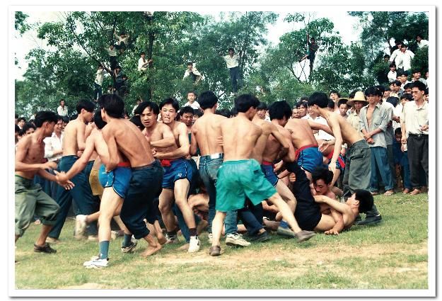 待賀節(jié)隊(duì)回到主會場,花炮節(jié)正式開始,首先是舞獅表演,接著蘆笙、卡羅舞表演,斗馬、斗鳥以及賽馬等活動(dòng)各自展開。這些活動(dòng)告一段落后,最精彩的節(jié)目——搶花炮開始了,人們像潮水般涌向主席臺前,圍成一個(gè)幾十個(gè)平方米的空地作搶花炮場地。搶花炮分一、二、三等,搶三次,得勝者,抬著漂亮的花炮頭及獎(jiǎng)品興高采烈地回村了。