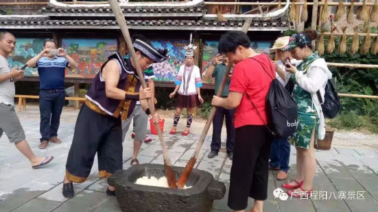糍粑 ,侗族特色小吃,是以糯米為主料,浸泡后擱飯甑里蒸熟,再迅速放在石舀里舂至綿軟柔韌,趁熱將飯泥制作成可大可小的團狀,擱芝麻炒香磨粉拌白砂糖(或是黃豆炒香磨粉拌白砂糖)的盤里滾動,即可取食。口感香甜。——平寨演藝中心