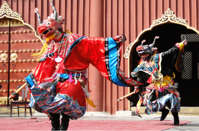 內(nèi)蒙古地區(qū)的查瑪樂舞已與藏族地區(qū)的“羌姆”明顯不同。隨著藏傳佛教傳入蒙古地區(qū)后,積極地吸收和融合了蒙古族傳統(tǒng)音樂舞蹈和薩滿教神舞的因素后形成了蒙古化的查瑪樂舞。因此,內(nèi)蒙古地區(qū)的查瑪具有復(fù)合型和多元性特點(diǎn)。2008年,查瑪樂舞被列入國家級非物質(zhì)文化遺產(chǎn)。