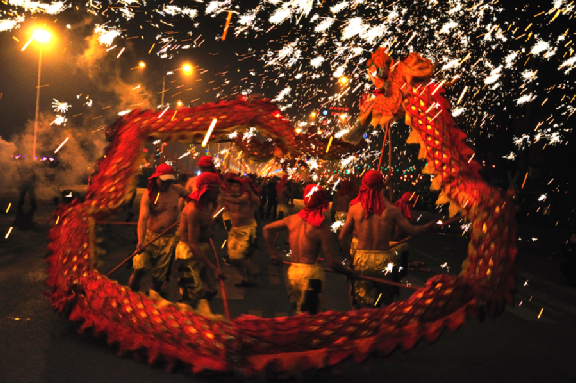 中華民族是一個富有創(chuàng)造力的民族。綜觀各地、各族人民的舞龍表演,種類繁多,各具特色。常見的有火龍、草龍、毛龍(貴州石阡)、人龍、布龍、紙龍、花龍、筐龍、段龍、燭龍、醉龍、竹葉龍、荷花龍、板凳龍、扁擔(dān)龍、滾地龍、七巧龍、大頭龍、夜光龍、焰火龍等近百種之多。
