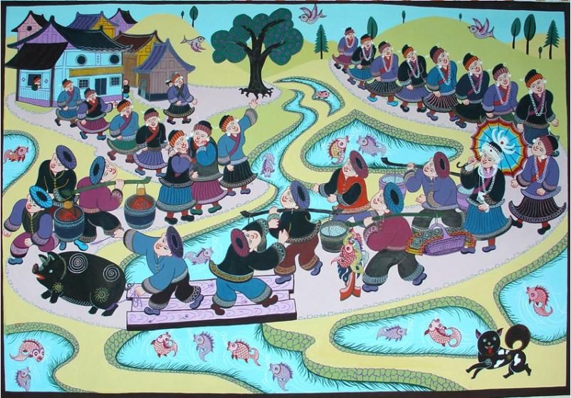 劍河現(xiàn)代民間繪畫源于傳統(tǒng)的苗族刺繡文化,是苗族刺繡文化的另一種表現(xiàn)形式和藝術升華。傳統(tǒng)的苗族文化多以服飾、歌舞為載體,并以刺繡及演唱等形式進行表現(xiàn)和傳承。早期劍河現(xiàn)代民間畫即脫胎于具有適用性的苗族刺繡樣稿——剪紙和手繪刺繡粉本,換言之,手繪的苗族刺繡粉本便是劍河現(xiàn)代民間繪畫的雛形,劍河第一批優(yōu)秀的現(xiàn)代民間畫作者,即是原當?shù)厥掷L粉本的能工巧匠。劍河現(xiàn)代民間繪畫多以苗族神話傳說中的故事情節(jié)和民俗節(jié)日、生產活動等內容為題材入畫,素材涵蓋自然界花鳥蟲魚及人物、家畜等具體形象,造型稚拙天真,設色濃艷,對比強烈。作品傳達出典型的地域民俗氣息及濃厚的鄉(xiāng)土味,便是其標志性特征。