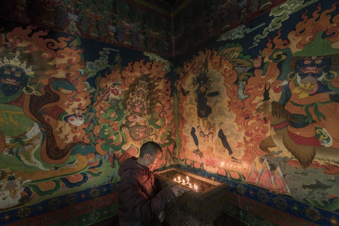西藏壁畫分布在寺廟、府第、宮殿、民宅、驛站、旅店等地方的墻壁上。而寺院則為壁畫聚集之所,大寺院往往有數(shù)十個到數(shù)百個殿堂,各個殿堂及其周圍走廊的墻壁、天花板等處均繪滿了壁畫,如果把這些壁畫一幅幅地排列起來,那確實是延綿不斷、絢麗多姿、色彩繽紛的美麗畫廊。
