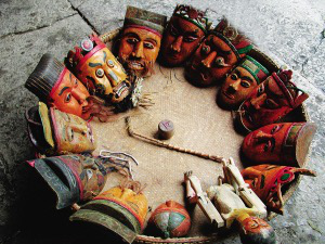 陽戲是一種原生態(tài)戲劇,其中道具的使用必不可少。主要包括服裝、面具、法器、樂器。面具在陽戲表演中占有突出的地位,是神靈的憑依和具象化。其面具有關圣帝、皇生、小生、老生、老丞相、元帥、老臣等共16面。在陽戲表演中,旦角(貴妃)是沒有面具的,搭帕子在頭上,身穿旦角服裝。面具為白楊木質(zhì)材料,精雕細琢,上面覆以濃重的彩繪。面具造型別致古樸,以頭冠和面相的特征區(qū)分角色,在藝術風格上頗具地方特色。
