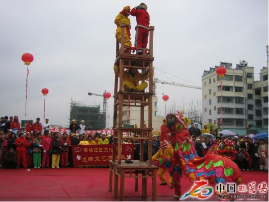 高臺是用5至7張八仙桌一層層疊壘,最上面的桌子四腿朝天,總高度近8米。四人登臺表演。兩個(gè)人扮獅子,把獅頭獅皮披在身上,只露雙腳;另外兩人分別裝扮成孫悟空和笑臉和尚揮舞手帕,大蒲扇逗引獅子逐層攀上高臺,為了穩(wěn)固,安全起見,每張桌子的四角都用草紙疊浸水后墊著防滑,做到萬無一失。