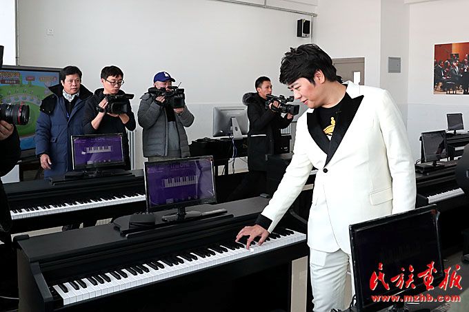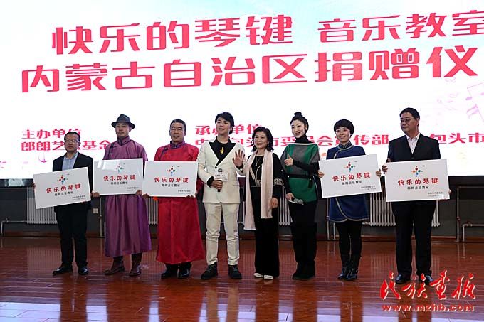 在“快樂的琴鍵”音樂教室捐贈(zèng)儀式上,朗朗與內(nèi)蒙古藝術(shù)劇院直屬烏蘭牧騎演員聯(lián)合表演了《鴻雁》。