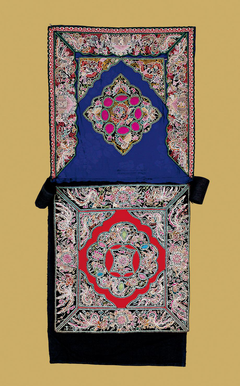 侗繡是侗族婦女最擅長的工藝,它是農(nóng)耕文化的產(chǎn)物。侗族刺繡已被列為少數(shù)民族優(yōu)秀文化遺產(chǎn),并且已經(jīng)逐漸走上產(chǎn)業(yè)化的道路。在侗族服裝中有許許多多的刺繡,它們出現(xiàn)在不同的部位,樣式、顏色也各不相同。除了服裝,刺繡在頭巾、嬰兒背帶、婦女胸兜、布花鞋、鞋墊、煙袋、挎包等也十分普遍。一件刺繡作品的完成,首先要把構(gòu)想或需要的圖案以剪紙的形式呈現(xiàn)出來,其次將剪紙貼在布條上,布條只有綠色、紅色和黃色。刺繡時,左手固定布條,右手自如地上下穿針。刺繡的顏色也基本上以紅色、綠色和藍(lán)色為主,十分貼近大自然。繡品不僅具有極高的裝飾價值,其反復(fù)繡綴的工藝還能增加衣物的耐用度。在侗繡中最出名的要數(shù)平秋侗繡。其發(fā)源于九寨,集紡織、印染、剪紙、刺繡于一體。這種繡種僅在錦屏縣平秋鎮(zhèn)及周邊的侗族群體中世代相傳。