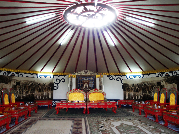 早先,蒙古人逐水草遷移,以氈帳為居室,所以蒙古人對制作氈帳有很高的技術。當?shù)啬撩竦臍謳び冒酌珰指采w,毛氈上面涂以石灰或白粘土和骨粉,使之更為潔白,有時也把毛氈涂成黑色。覆蓋在天窗周圍的毛氈,飾以各種圖案,門口懸掛著繡有各種顏色圖案的毛氈。大汗及諸王的氈帳則涂上金色,舉行宴會的氈帳可容納2000人。金帳之稱謂也由此而來【老鐵供圖】。