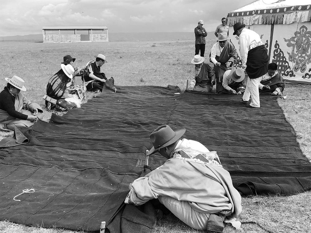 男子捻線,女子編織。燃燒著的牛糞餅吐著火苗咝咝作響,奶茶香味四溢。男子和女子,在這溫馨和諧的畫面中,用黑牛毛編織著新家。不管是風霜雨雪的日子,還是風吹日曬的歲月,黑牦牛帳篷總以看似柔弱的身軀遮擋風寒,為牧人營造一個溫馨而舒適的家。