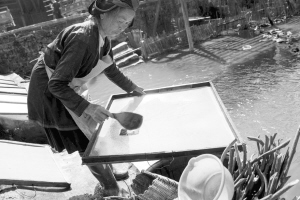 占里村共有182戶827人,這里的侗族古法造紙術(shù)源遠流長,全村從事造紙業(yè)的就有170戶,占總戶數(shù)的93%。這里的造紙業(yè)依然保留著原始的家庭作坊和世代傳承的手工制作方式。這種古法造紙技藝以構(gòu)樹皮為原材料,添加獼猴桃藤、野棉花根,經(jīng)過水浸泡、石灰腌制、蒸煮、碓爛、攤曬、燒堿漂白、打漿、瀝水、抄紙、烤干等72道工序,最終制成白皮紙。