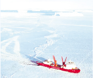 “雪龍”號是中國最大的極地考察船,也是中國唯一能在極地破冰前行的船只。“雪龍”船耐寒,能以1.5節(jié)航速連續(xù)沖破1.2米厚的冰層(含0.2米雪)。簡單來說,“雪龍”號船底有許多密封艙,破冰時(shí)先把后部的密封艙用幾千噸的海水灌滿;這樣船頭自然翹起,壓騎至冰面之上;然后再把前部的密封艙灌滿海水,后部的海水排出,利用船體前部的巨大壓強(qiáng),把堅(jiān)冰壓裂破開。