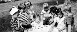 1950年,聯(lián)合國(guó)國(guó)際育童學(xué)校的孩子們?cè)陂喿x第一張《世界人權(quán)宣言》的海報(bào)。