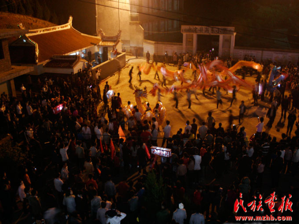 鼓聲起,鑼鼓響,鞭炮鳴。一片歡呼聲中,“龍”忽上忽下,左搖右擺地從承啟樓游出。由于五云樓是幾座土樓中最老的一座,里面還供奉著江集成及其夫人的塑像,所以拜訪從那里開始。進(jìn)入五云樓,“龍”首先來到中堂,三鞠躬,敬拜祖先和觀音。然后,“龍”開始去樓里每戶家里拜訪,各家紛紛燃放鞭炮迎接龍的到來。從五云樓出來后,“龍”前往保生大帝廟參拜諸神。據(jù)記者觀察,只要途中路過寺廟佛堂和樹神所在地,“龍”都會去參拜。