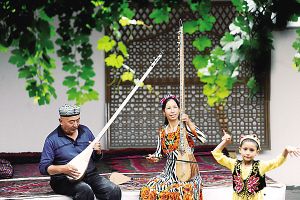 走進艾依提·依明家,更像是走進了一座民族樂器展覽館。記者看到,庭院中央鋪著紅色的地毯,4名自治區(qū)級非遺傳承人一字兒排開,正演奏著維吾爾族傳統(tǒng)音樂十二木卡姆的篇章,前來參觀的游客們也紛紛參與到歌舞表演之中。彈奏結(jié)束后,傳承人之一的買買提·鐵木爾熱情地向觀眾展示手中精致的都塔爾,自豪地分享著自己摸索出來的一套制琴和調(diào)音的秘訣。