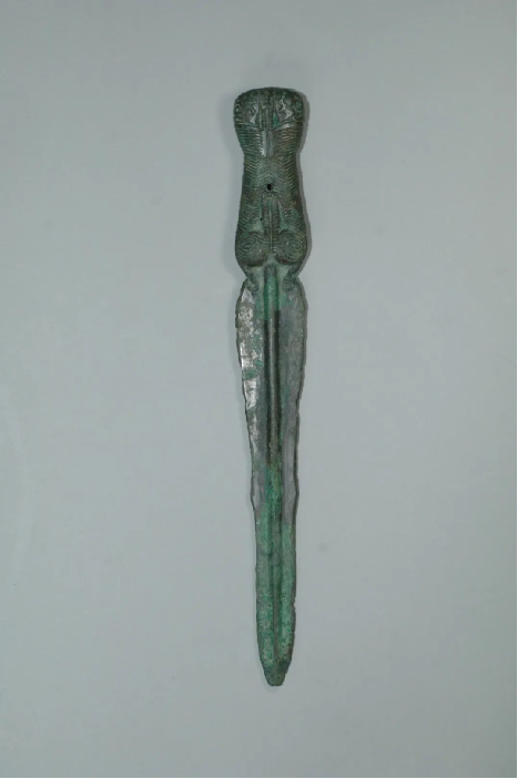 第四,夏家店上層文化中大量的游牧和騎馬民族文化因素,應(yīng)是晚商以來,伏爾加河流域的塞伊瑪文化經(jīng)南西伯利亞、外貝加爾地區(qū)的卡拉蘇克文化和塔加爾文化到達蒙古高原和中國北方長城地帶,形成諸青銅文化,繼而進一步向東方推進,抵達夏家店上層文化。其中受長城地帶柄身連鑄匕首式短劍影響,形成夏家店上層的銎柄直刃劍,各種動物雕塑形象也被吸收借鑒,在夏家店上層廣泛流行開來。