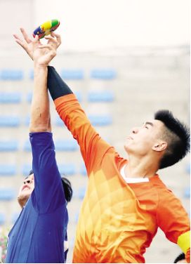 江西隊(duì)選手在混合雙蹴比賽中起腳擊球 何五昌攝