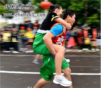 在昌江黎族自治縣一帶流行。每年的農(nóng)歷十五前后,孩子們就聚居在一空曠地,舉行村與村之間比賽。可根據(jù)人數(shù)來分組,每組2人(一男一女),每次由兩組進(jìn)行,實(shí)行淘汰制,男背著女或女背著男亦可,與對(duì)方互相碰撞,男女通過踢、拉、推等動(dòng)作,千方百計(jì)地把對(duì)方背著的人或拉下,或把兩人分開,或倒地。在場(chǎng)觀看的人興高采烈,笑聲不斷,其樂無窮。