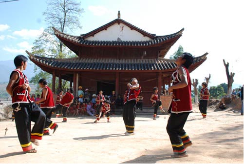 佤族同胞在雙江這片紅土地上長期繁衍生息,積淀了自己獨特的生活和文化習(xí)俗。其中最彰顯佤族驃勇個性的就是體育競技“雞棕陀螺”。雞棕陀螺迄今只為雙江佤族所獨有,在全國獨一無二。表演雞棕陀螺極富難度技巧。雞棕陀螺用質(zhì)地堅硬的紫楊木制作,因其外觀像野生菌雞棕而得名。其表演要領(lǐng)是: