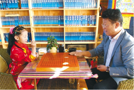 西藏自治區(qū)藏棋協(xié)會秘書長阿旺邊巴正在與孩子下棋。