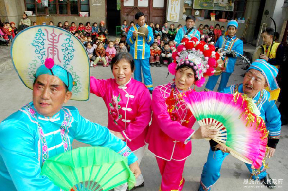 利川燈歌,又名燈調(diào),始于清代初期,已有300多年的歷史,是人們逢年過(guò)節(jié)之時(shí)以彩龍船為道具,畫地為臺(tái)、亦唱亦演的民間藝術(shù)形式。2011年5月,利川燈歌被國(guó)務(wù)院公布為第三批國(guó)家級(jí)非物質(zhì)文化遺產(chǎn)名錄。