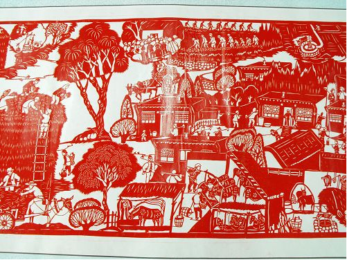 2、達拉特紀(jì)事剪紙的歷史價值很高,《農(nóng)民紀(jì)事圖》上卷記載了從建國到現(xiàn)在農(nóng)村的發(fā)展變化,在作品中我們看到了很多瀕臨失傳的農(nóng)村生產(chǎn)生活工具和生產(chǎn)方法,也能看到黨和國家在每一年出臺的各項惠農(nóng)利民政策,對于研究歷史具有重大的文獻價值。