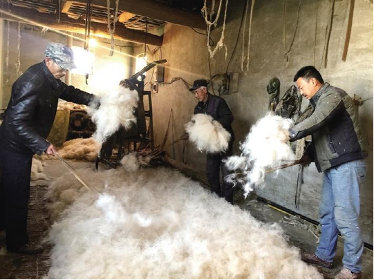 “都一樣,我們弟兄幾個(gè)學(xué)搟氈的年代都差不多。”杜占福說(shuō),搟氈看似簡(jiǎn)單,其實(shí)也是一門復(fù)雜的手藝,一般都是兄弟幾人聯(lián)手干,這樣才能生產(chǎn)出杜家獨(dú)有的羊毛氈。說(shuō)著,父子幾人嫻熟地拿著手中的剪子,配合著各自手中握著的手掌子,頗有韻律地抖動(dòng)著手中的羊毛,精細(xì)地完成著搟氈中鋪羊毛的步驟。