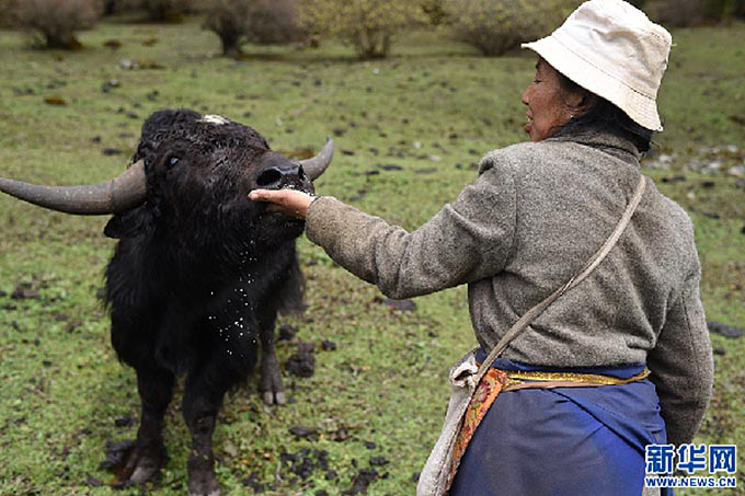 2018年5月9日,跟隨“新時代·幸福美麗新邊疆”網絡主題活動的隊伍,記者來到玉麥,見到了卓嘎本人。從北京回到玉麥的卓嘎,又變回了那個樸實的放牧守邊人。見到卓嘎時,她正拿著飼料準備去山上的草場喂牛。這也是她每天最忙碌的時刻。