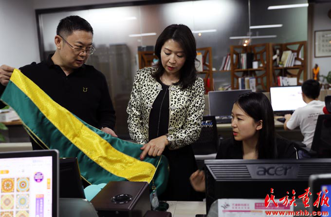 孔麗(中)是來自云南德宏的景頗族,她的公司致力于將少數(shù)民族優(yōu)秀文化與商業(yè)相結(jié)合,這是她在與公司員工商議產(chǎn)品設(shè)計方案(和勇 攝影)