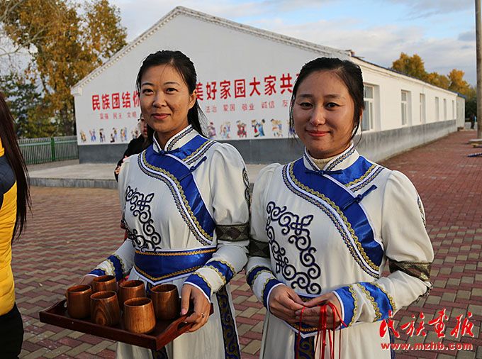 黑河市愛輝區(qū)坤河達斡爾族滿族鄉(xiāng)的達斡爾族群眾發(fā)展鄉(xiāng)村旅游。圖為村民用奶茶迎接賓朋。