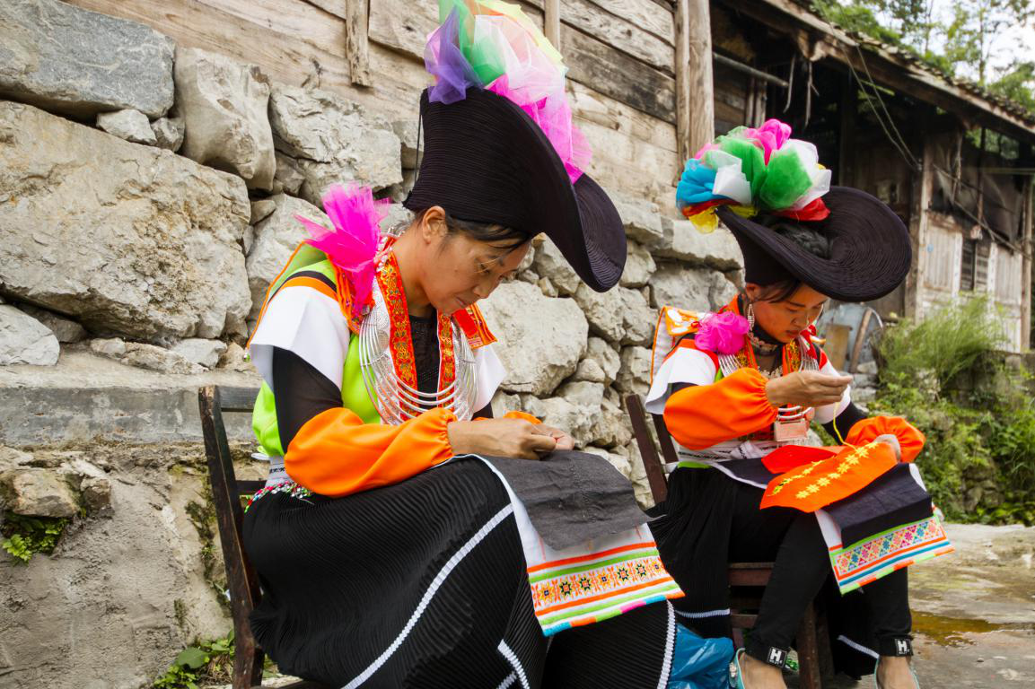 而批林村的女子傳統(tǒng)服飾較之男子則略顯復(fù)雜。批林村女子上衣以短袖開(kāi)衫服飾為主,短袖開(kāi)衫服飾顏色多變。在短袖開(kāi)衫上還需戴上刺繡而成的背牌,背牌分為兩扇,一前一后。后背牌較大,但較短。前背牌較長(zhǎng),長(zhǎng)至腰,背牌系帶上繡有圖案,以花草為主,顏色多變,前背牌需要用腰帶系住。批林村年輕女子在背牌之上還會(huì)帶上銀飾,胸前銀飾以銀圈為主。后背則是一串圖案銀飾,圖案多花草。除了前后背牌有銀飾外,前后背牌系帶上也有圓形雕花銀飾。批林村女子下裳則是以百褶裙為主,百褶裙顏色多以黑色為主,在下裙擺繡以白邊。百褶裙前還有系有兩層黑色圍腰,身后有三條彩帶自腰間垂下,垂至小腿。彩帶顏色亮麗,圖案優(yōu)美。批林村女子頭飾是用六米長(zhǎng)的青褐布折成,形式像一只船,稱為百褶帽,常用重大節(jié)慶,一些女子還會(huì)在百褶帽上繡上彩巾。