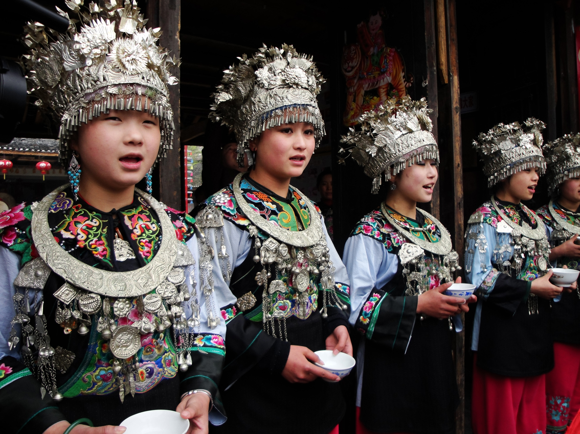 攔路酒。 苗族人熱情好客,在進(jìn)苗寨途中設(shè)有“攔路酒”。一般有三、五道,最多時(shí)有十二道,如果客人酒量尚淺,只怕沒進(jìn)寨門,先醉倒了。