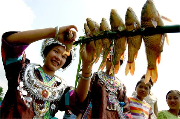 燒魚是廣西融水苗胞的習俗之一,融水的苗族同胞素有在稻田里養(yǎng)魚的習慣,每年春插,苗家人向來喜歡在稻田里放養(yǎng)鯉魚。每年的秋收稻黃時節(jié)也是田鯉肥壯之時,這時來自四鄉(xiāng)八寨眾多的各民族兄弟便匯聚起來,點燃一堆堆篝火,燒田鯉吃野餐,盡享豐收喜悅。燒魚從9月稻黃收割開始持續(xù)到12月底才正式結束,故名“元寶山金秋燒魚季”。燒魚季節(jié),苗寨家家戶戶釀起醇濃的甜酒,蒸著香噴噴的糯米飯,帶上食鹽、辣椒、蒜苗、蔥花、薄荷等佐料上山去剪禾。晌午時候,他們在田頭或田邊的平地燒起一堆堆篝火,從田里抓來一籠籠活蹦亂跳的鯉魚,用樹枝或竹片把魚一條條串起,排成一排,然后放在紅彤彤的火炭上翻來覆去地烤,大約半小時左右,魚被烤炙得“呲呲”作響,水分烤干,慢慢地變黃,直至熟透,香飄四溢,遠遠就可聞到香味。