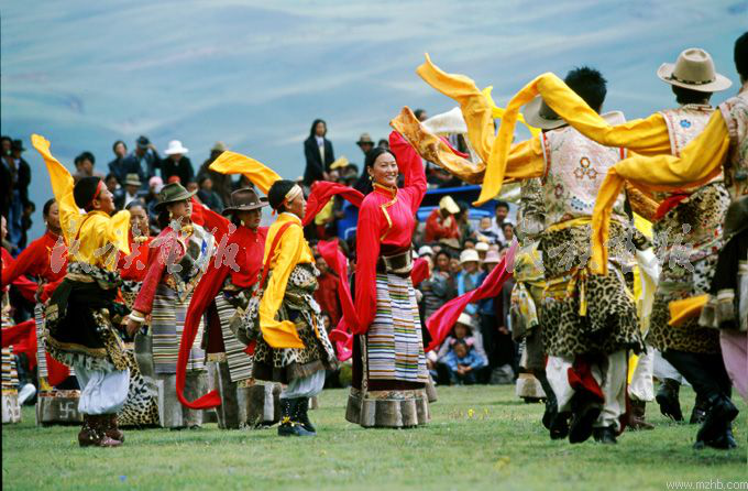 到17世紀(jì)中葉,“雪頓”活動內(nèi)容更加豐富,已開始演出藏戲,并以哲蚌寺為活動中心開展活動,故又稱之為“哲蚌雪頓”,從此便形成了固定的雪頓節(jié)。五世達(dá)賴羅桑嘉措從哲蚌寺移居布達(dá)拉宮后,每年藏歷六月三十日,首先在哲蚌寺舉行藏戲匯演,次日則必須赴布達(dá)拉宮演出。18世紀(jì)下半葉羅布林卡(寶貝圓林)建成,達(dá)賴?yán)镆凭恿_布林卡,雪頓節(jié)的活動又從布達(dá)拉宮轉(zhuǎn)移到羅布林卡。每年藏歷七月一日,由拉薩、日喀則、窮吉、雅礱、堆龍德慶、尼木等地的藏劇團(tuán),6個“扎西雪巴”(藏戲的一種)戲班子,一個牦牛舞班子和一個“卓巴”(打鼓舞隊),在羅布林卡進(jìn)行聯(lián)合演出。屆時,噶廈政府機(jī)關(guān)放假,全體官員要集中到羅布林卡陪同達(dá)賴?yán)镉^看藏戲,中午噶廈政府要專門設(shè)宴招待全體官員,席間不能缺少酸奶,以示對節(jié)日由來的紀(jì)念。在此期間,允許拉薩市民及附近藏族群眾進(jìn)入羅布林卡觀看藏戲演出,這便逐漸形成了一整套固定的節(jié)日儀式。雪頓節(jié)經(jīng)過了300多年的發(fā)展歷史,從宗教節(jié)日演化為藏戲藝術(shù)節(jié)。故此,現(xiàn)代人把雪頓節(jié)稱之為“藏戲節(jié)”。